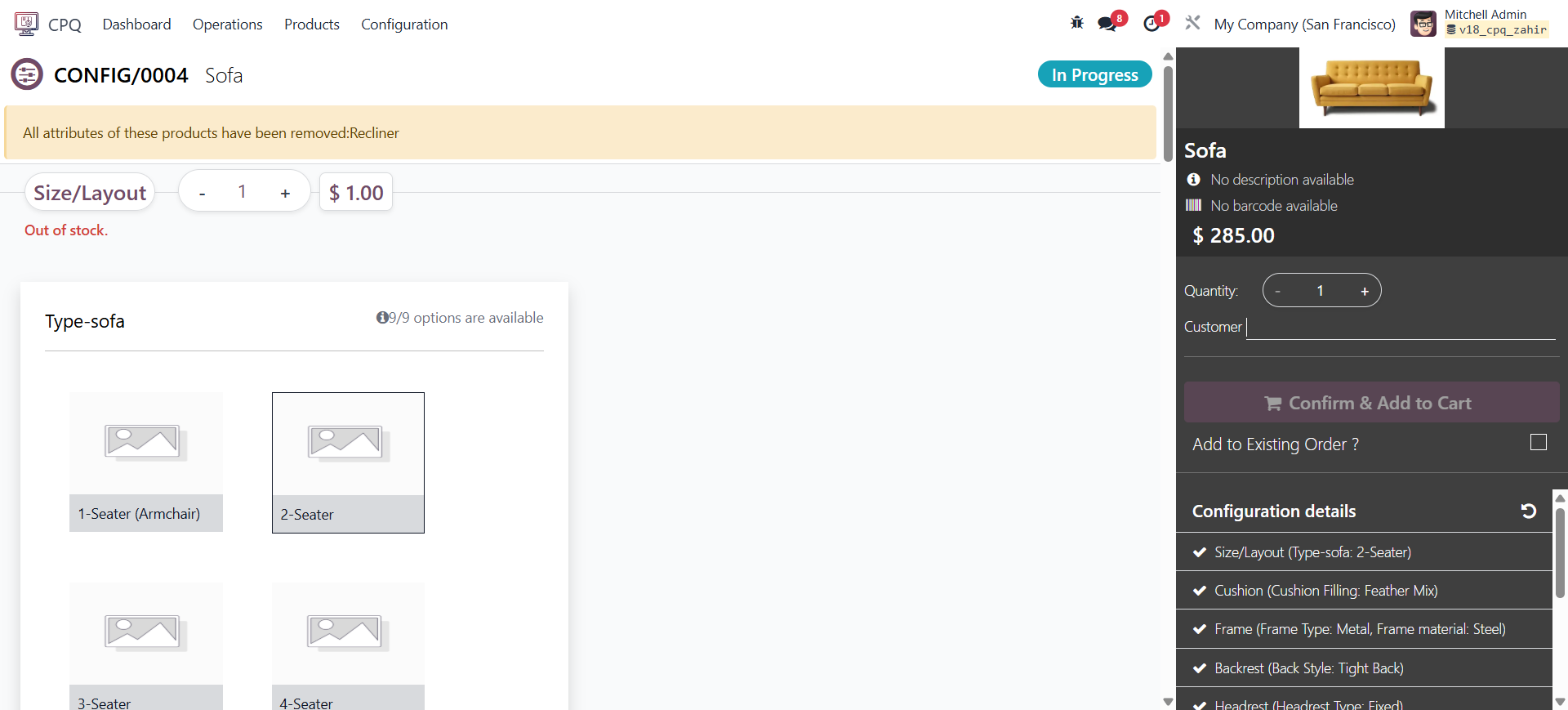When you configure a Configurable product, add a customer, confirm the configuration, and add it to the cart, the system generates a quotation. Based on this quotation, the corresponding Bill of Materials (BoM) is automatically created.
