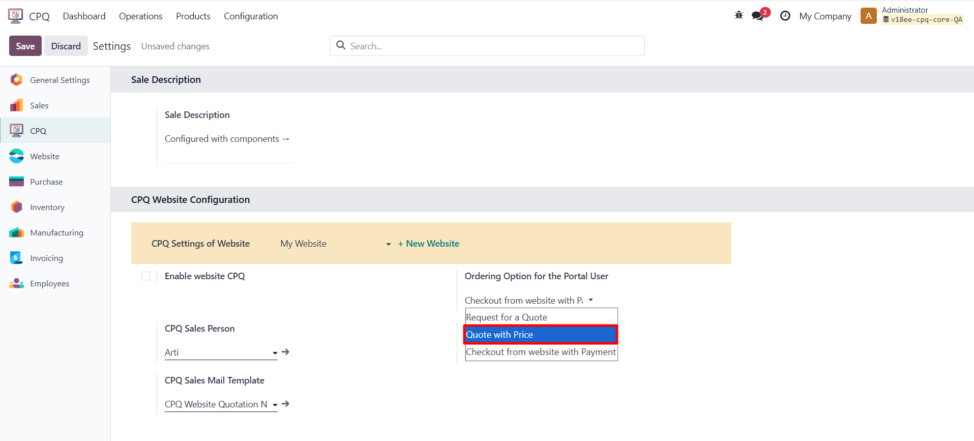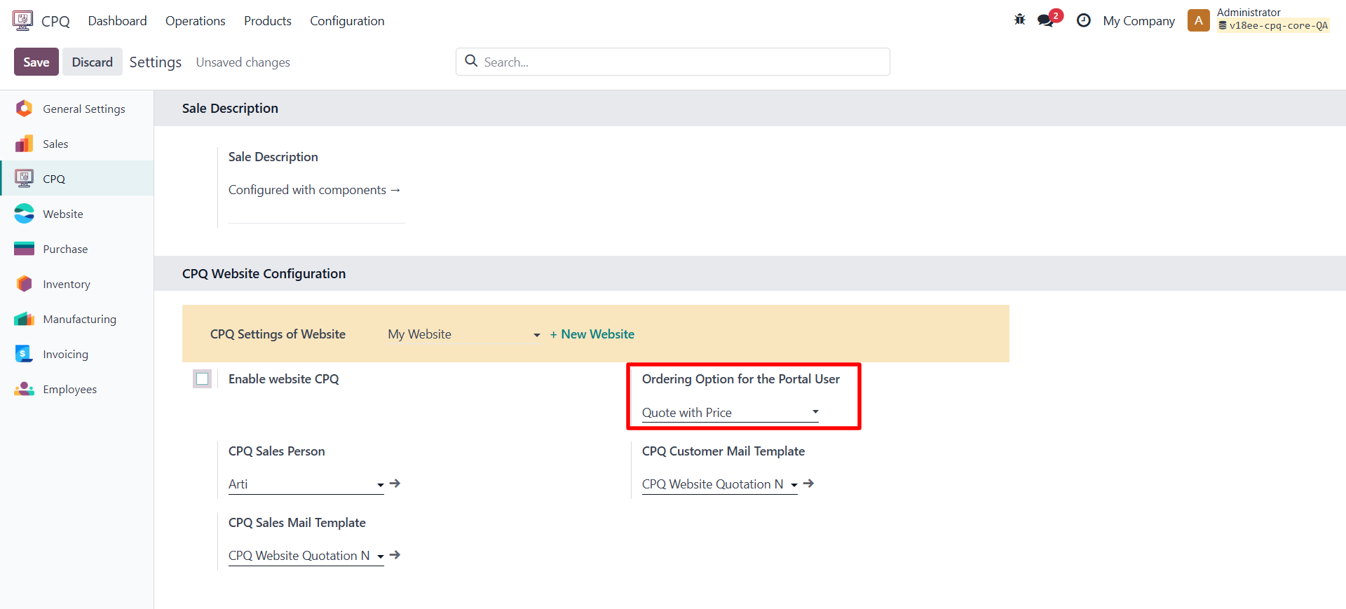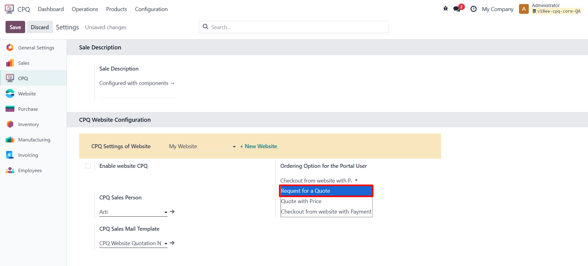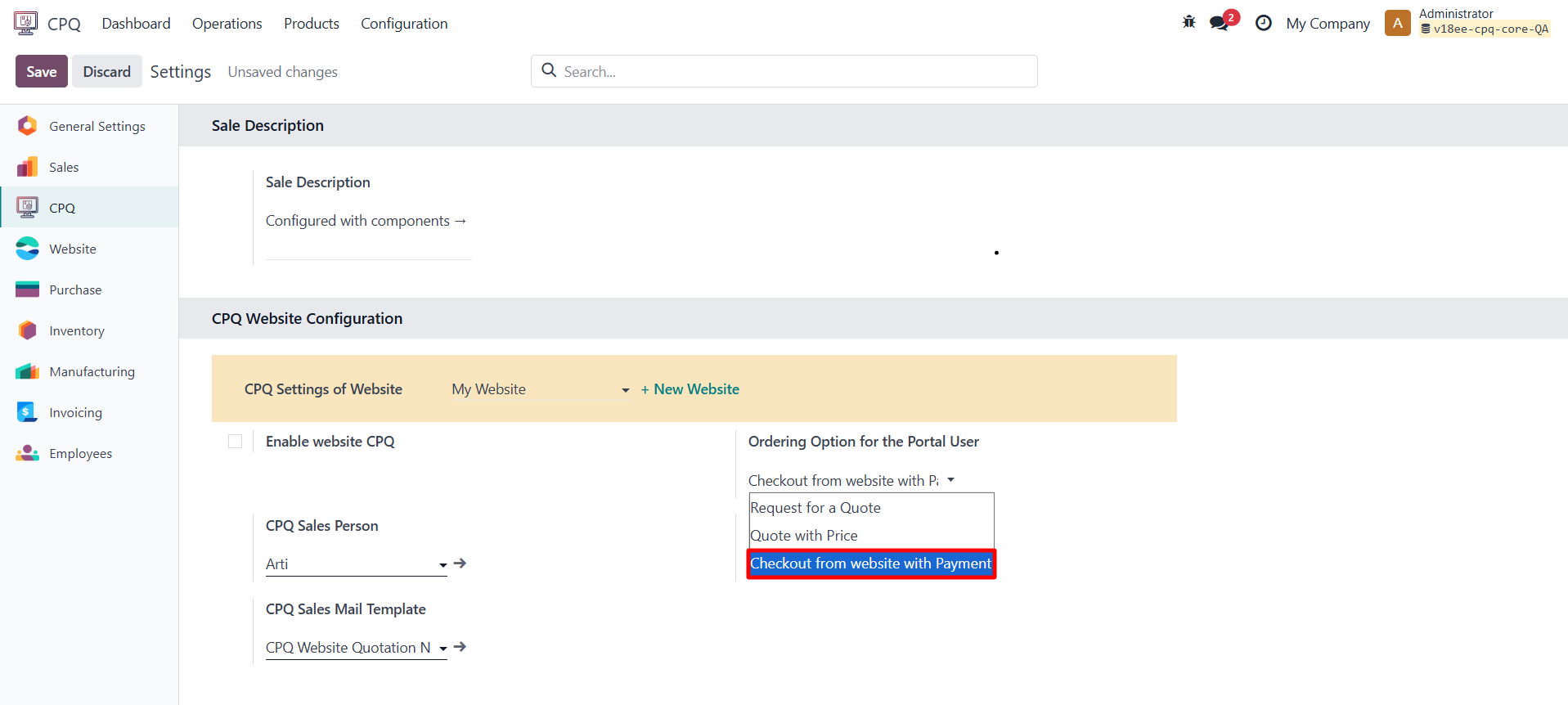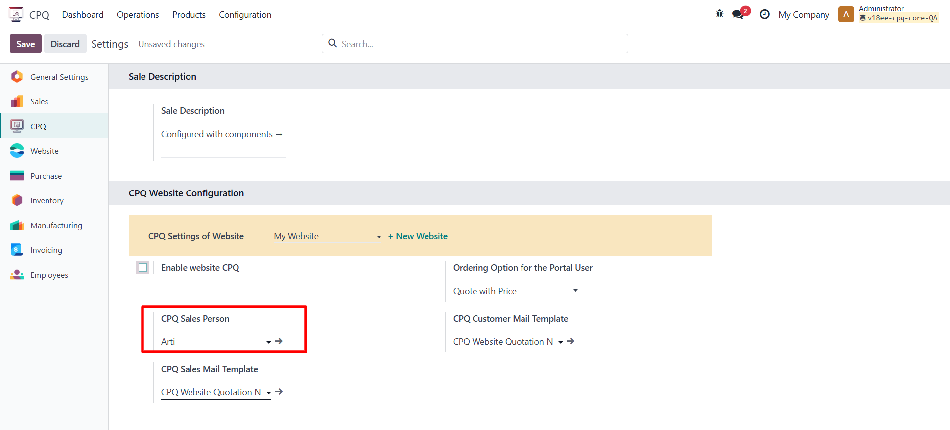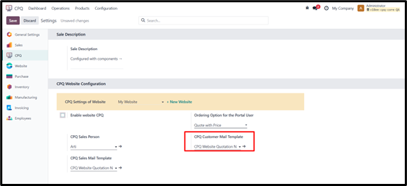 • Go to CPQ ? Configuration ? Settings and enable the option “Enable Website CPQ” in the CPQ Website Configuration tab.