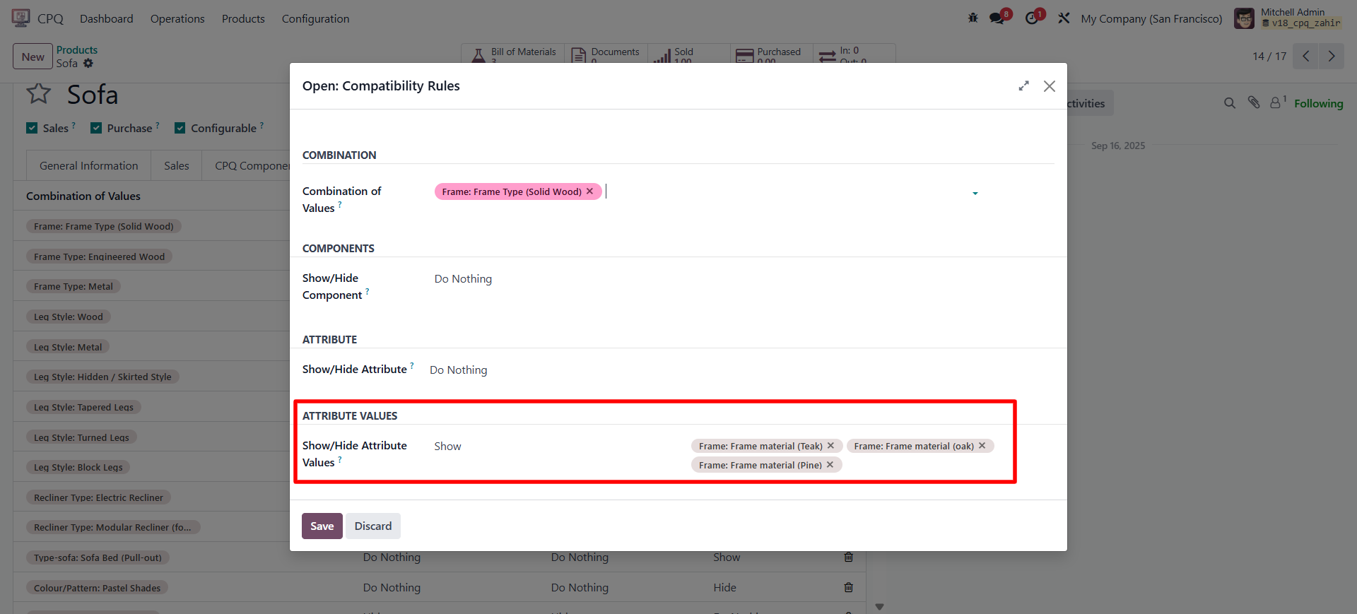 • You can define a specific combination of component values (e.g., Frame Type: Solid Wood) that will trigger the rule.